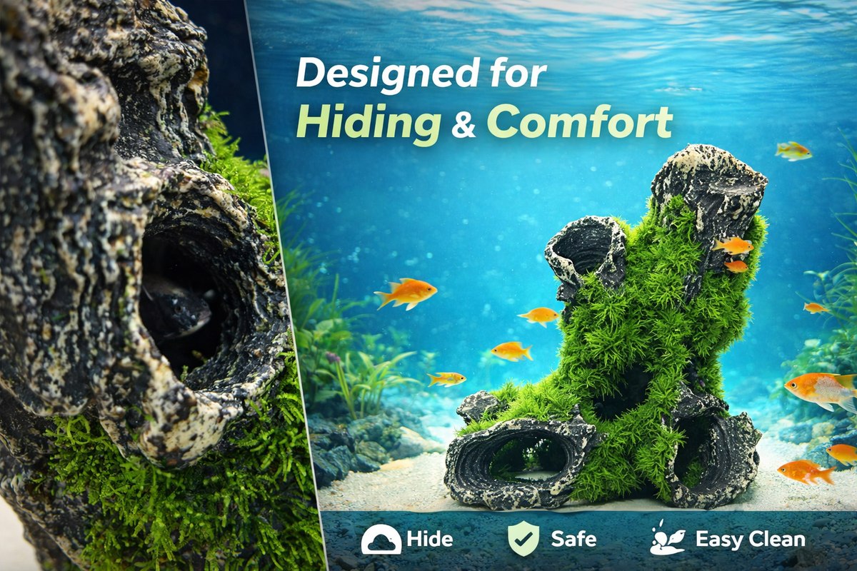 Aquarium-safe materials designed to blend seamlessly with plants, rocks, and aquatic life.